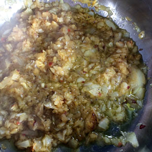 Tritate la cipolla e l’aglio e fateli rosolare per qualche minuto in una pentola con un filo di olio, aggiungete tutte le spezie e lasciate sprigionare tutti i meravigliosi profumi di questo piatto.
