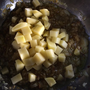 Ancora qualche istante e aggiungete le patate a dadini. Lasciatele insaporire per due minuti.